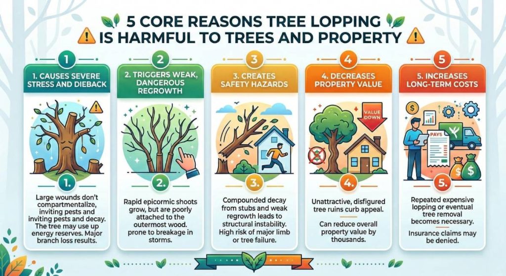 A lopped tree will need repeated intervention as the weak regrowth creates ongoing hazards. Many lopped trees eventually require full removal, which is significantly more expensive than proper pruning would ever have been.